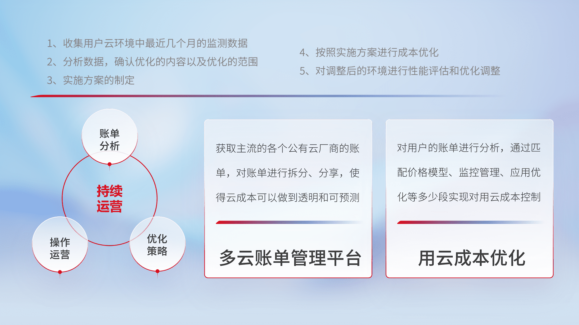 通过多云纳管,,,以统一的资源数据模型把客户的云资源进行抽象和封装,,进而实现对多云资源的统一操作,,保障云资源管理的可靠性、、、稳定性与可用性。。量身定制化运维内容,,配置、、开发运维、、、补丁管理、、、、备份、、、监控、、认证和访问管理、、、审计和日常巡检等,,保障在用云过程中的可靠度,,稳定度以及高可用率。。