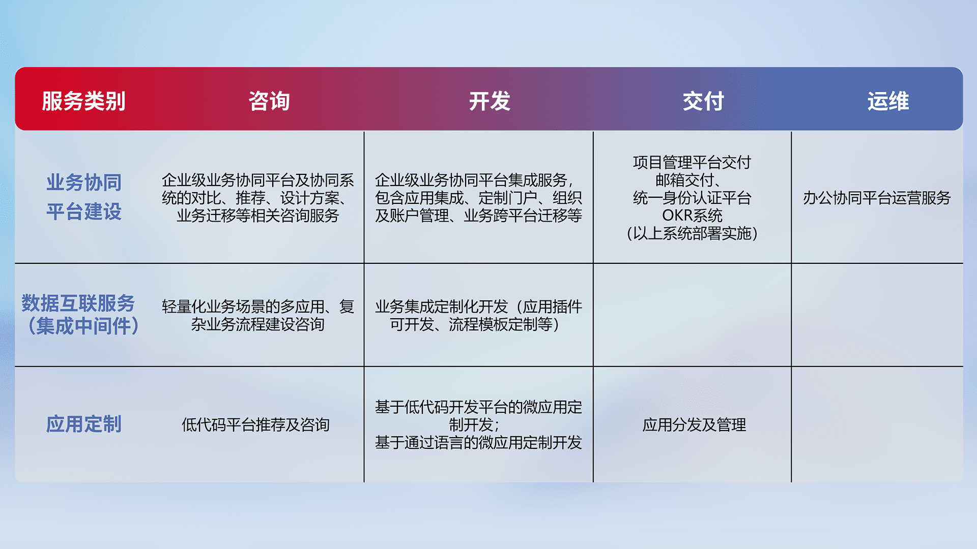 针对钉钉、、、企微、、、IDaas等平台级产品提供产品的规划、、方案、、交付、、、、定制化开发等服务,,,,实现如统一协同办公、、、、智能客户服务、、混合会议管理、、智能数据查询、、、等业务场景,,实现数字化转型。。。。